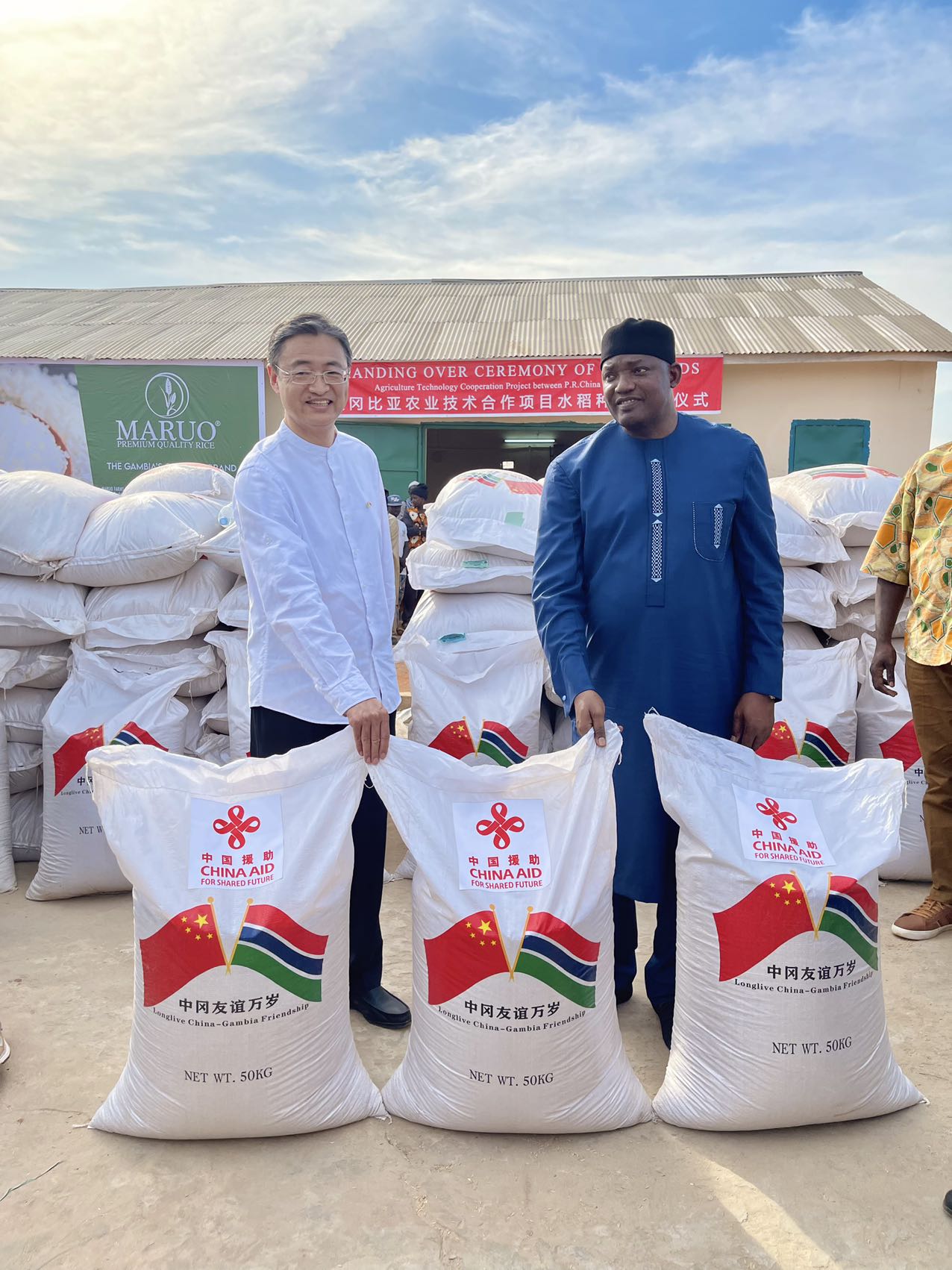 刘大使代表中方向巴罗总统捐赠了9吨杂交水稻稻谷和6吨高产稻种,并与巴罗总统共同为中国专家们组装的冈比亚第一台现代化联合碾米机剪彩。随后,巴罗总统还兴致勃勃亲手操作机器,碾出了第一袋大米。听着碾米机运转的轰隆声,看着洁白的大米流淌而出,在场人员热烈鼓掌。